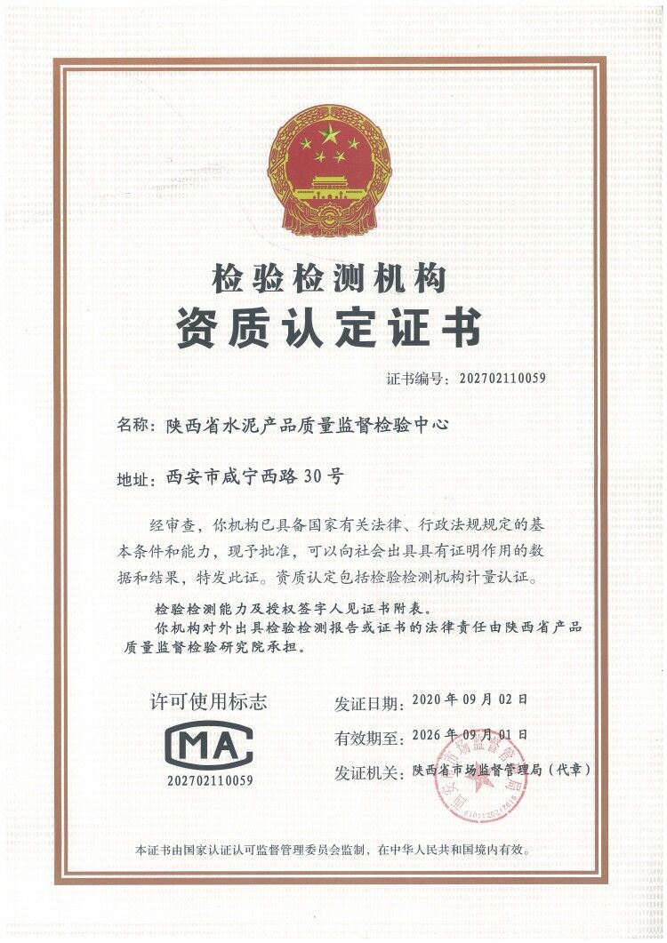 资质认定证书(陕西省水泥产品质量监督检验中心)