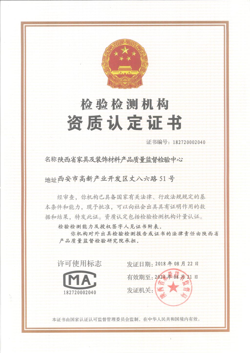 资质认定证书(陕西省家具及装饰材料产品质量监督检验中心)