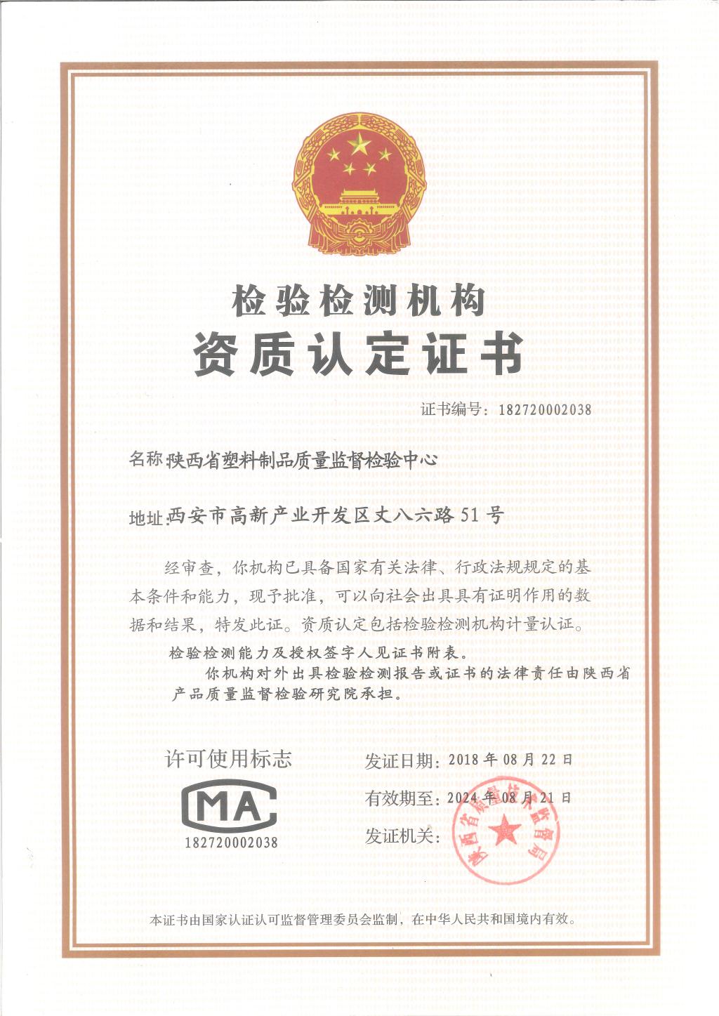 资质认定证书(陕西省塑料制品质量监督检验中心)
