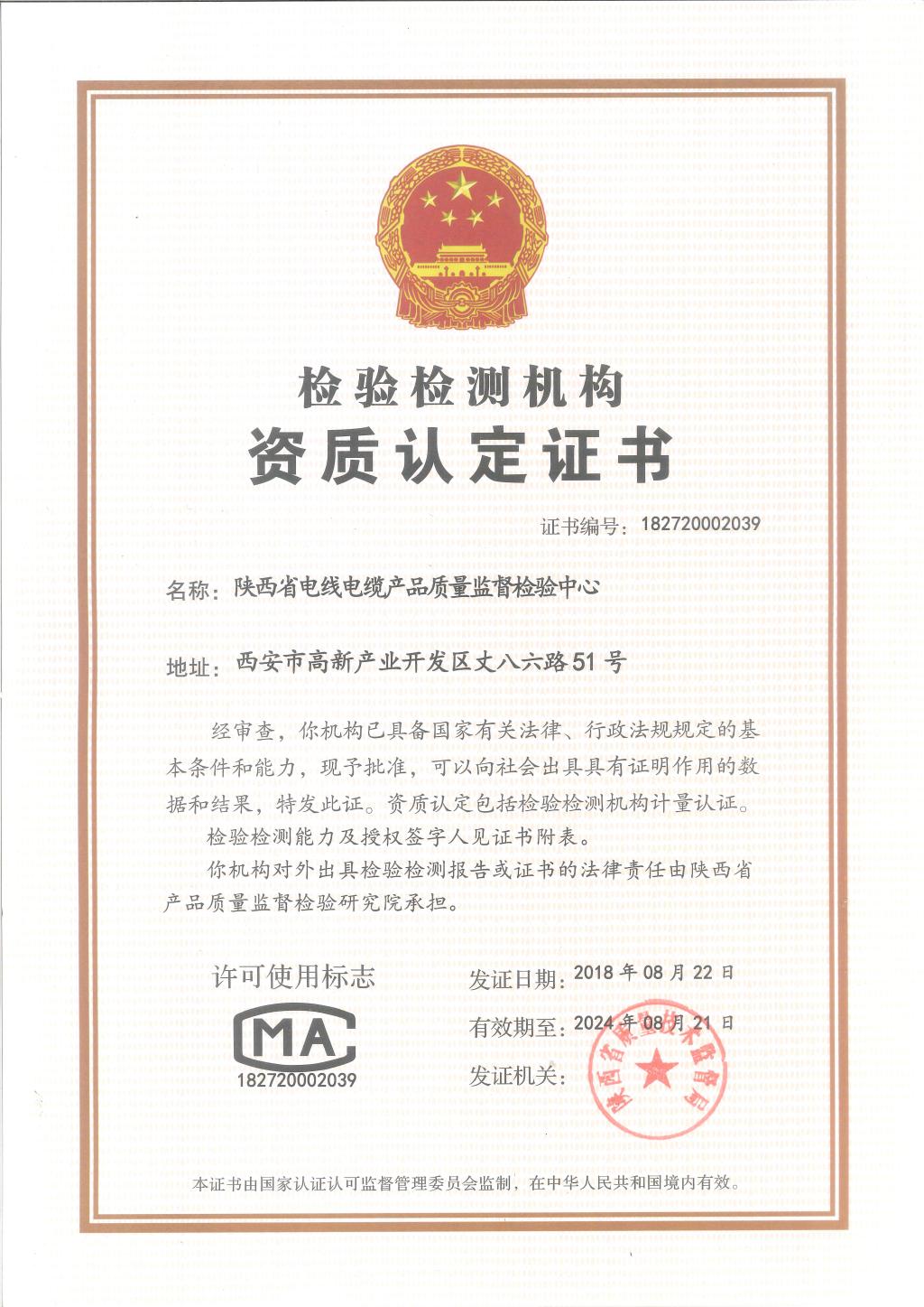 资质认定证书(陕西省电线电缆产品质量监督检验中心)