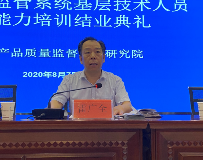 2020年8月7日上午,由陕西省市场监督管理局举办的全省市场监管系统基层技术人员业务能力第一期培训班结业典礼在省质检院举行。参加结业典礼的有本期7个专业培训班班主任及参加培训的全体学员,共计44人。省市场监督管理局科技与信息化处一级调研员万旭辉、四级调研员张奇、省质检院院长雷广全出席了会议,会议由省质检院副院长陈勇主持。