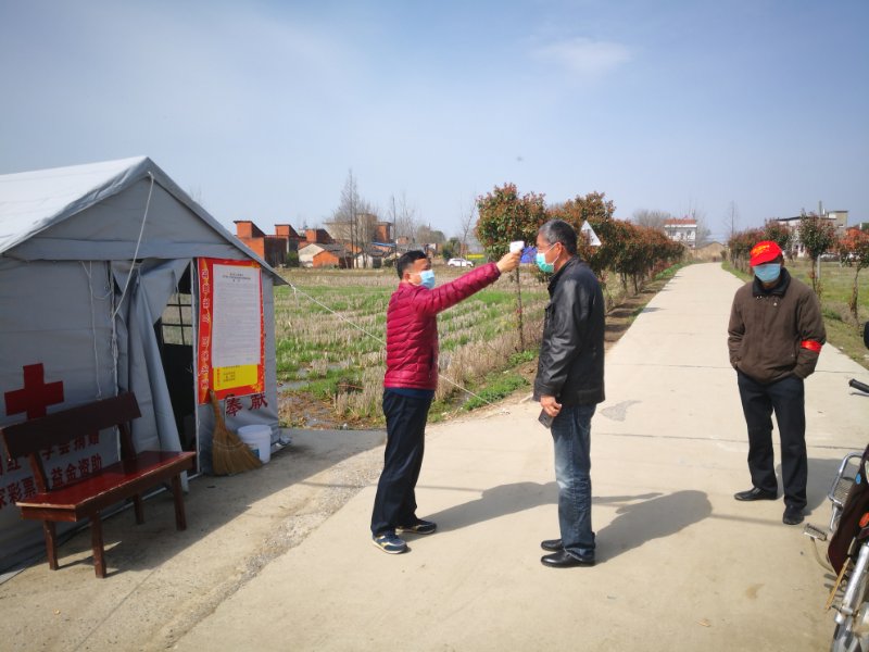 湖北天门公议新村村口,党员曹安波同志正在为村民检测体温