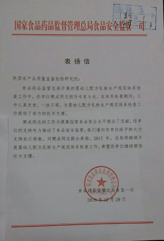 国家食品药品监督管理总局食品安全监管一司对我院为提高国家食品安全水平做出的贡献给与了肯定,并对樊成同志提出表扬。