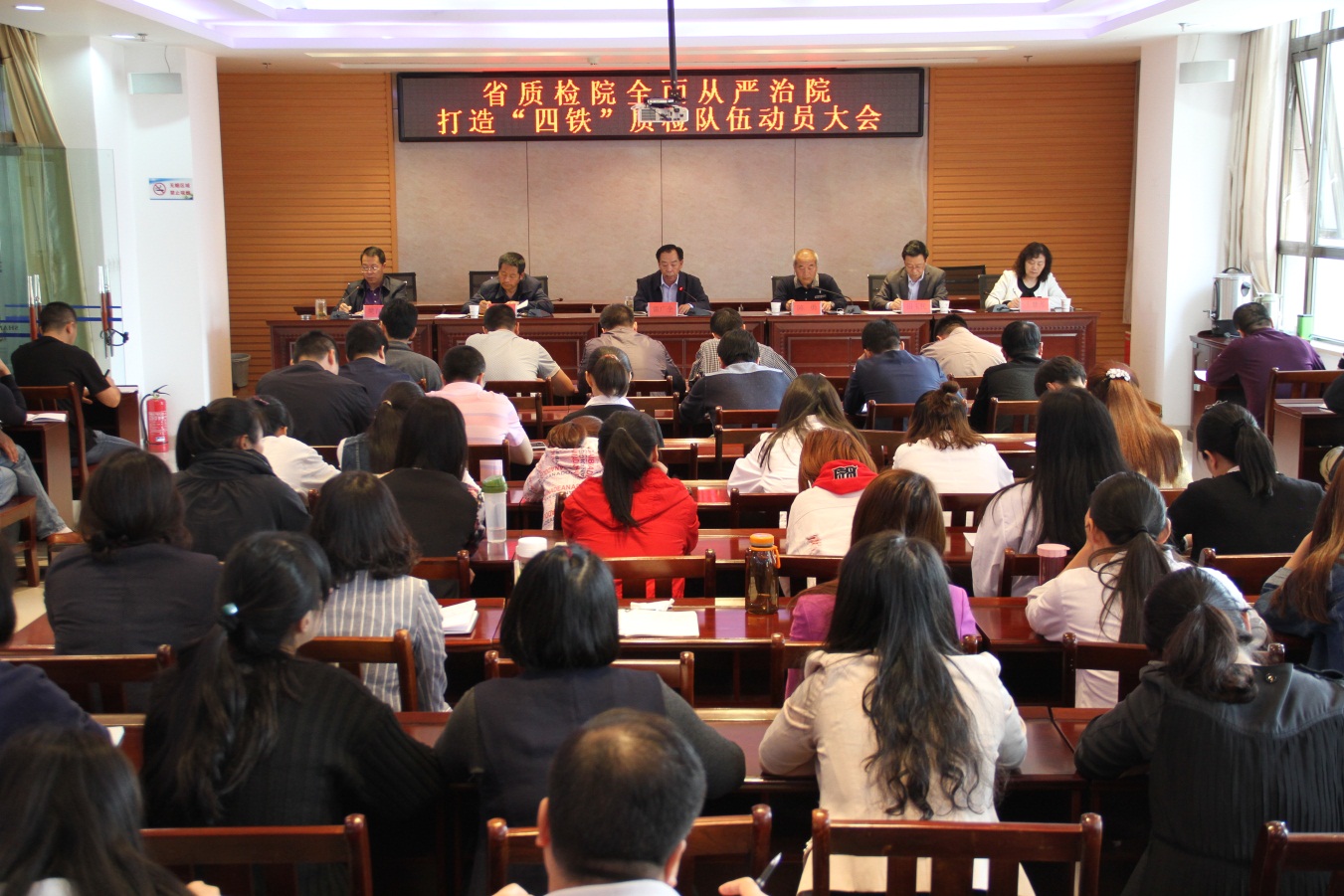 为深入贯彻省局《开展“从严治局,打造‘四铁’干部队伍”活动实施方案》的要求,落实乔局长在省局全面从严治局动员大会上的讲话精神,2017年5月4日上午,省质检院召开全面从严治院打造“四铁”质检队伍动员大会。会议由陈勇副院长主持,雷广全院长做了动员讲话。院领导班子、中层以上干部及职工代表共计90余人参加了会议。