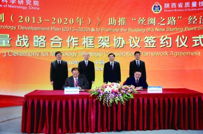 质检总局局长支树平(左二)、陕西省省长胡和平(右二)、质检总局副局长吴清海(左一)出席在西安举办的计量促进产业发展国际论坛,并见证中国计量科学研究院与陕西省质监局签署双方计量战略合作框架协议。右一为陕西省政府秘书长陈国强。