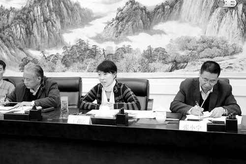 2014年1月3日,陕西省质量强省工作推进委员会第一次工作会上,副省长王莉霞(中)做工作部署,副秘书长张小宁(右一)主持会议,质监局局长仵西居做2013年质量兴省工作总结。