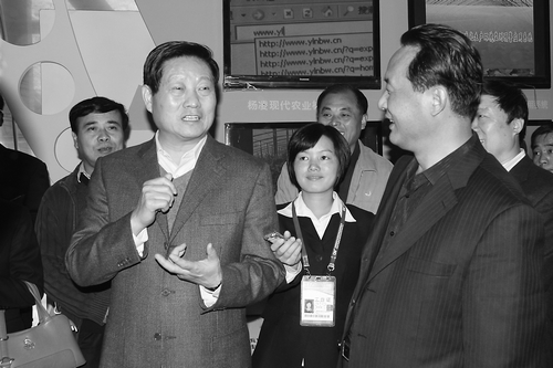 陕西省委书记赵正永(左二)在担任省长时,赶赴陕西杨凌农业高新技术产业示范区,视察农业标准化成果展,并听取该省质监局局长仵西居(右一)筹备情况工作汇报。
