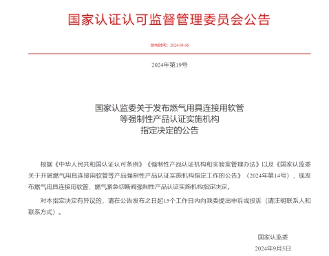 2024年9月5日,国家认证认可监督管理委员会发布《国家认监委关于发布燃气用具连接用软管等强制性产品认证实施机构指定决定的公告》(2024年第19号),省质检院获批成为燃气用具连接用软管强制性产品认证全国首批指定实验室之一。