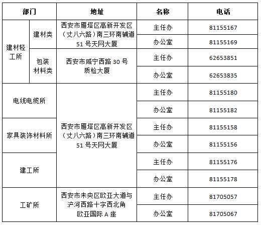 陕西省产品质量监督检验研究院建材轻工所(陕西省塑料制品质量监督检验中心)、电线电缆所(陕西省电线电缆产品质量监督检验中心)、家具装饰材料所(陕西省家具及装饰材料产品质量监督检验中心)、建工所现已搬迁至高新区天网大厦;工矿所现已搬迁至未央区欧亚国际。具体地址及联系方式如下: