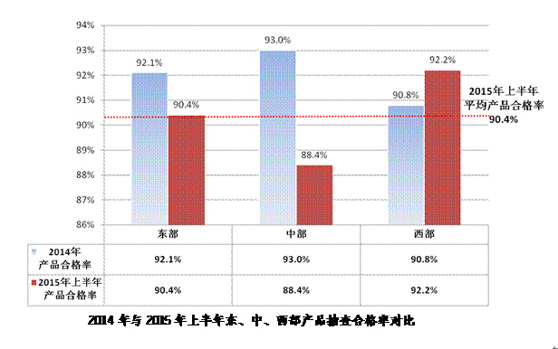 (二)从抽查地区分布来看,东部地区抽查产品数量较多,共抽查1945批次,占抽查产品总数的78.6%;中、西部地区分别抽查了250批次和281批次,占抽查产品总数的10.1%和11.3%。东、中、西部抽查产品质量水平存在较大差异。东部地区产品抽查合格率为90.4%,与国家监督抽查全国平均水平持平;中部地区产品抽查合格率为88.4%,低于国家监督抽查全国平均水平2个百分点;西部地区产品抽查合格率为92.2%,高于国家监督抽查全国平均水平1.8个百分点。与2014年相比,西部地区抽查合格率提高了1.4个百分点,东部和中部地区分别下降了1.7和4.6个百分点。
