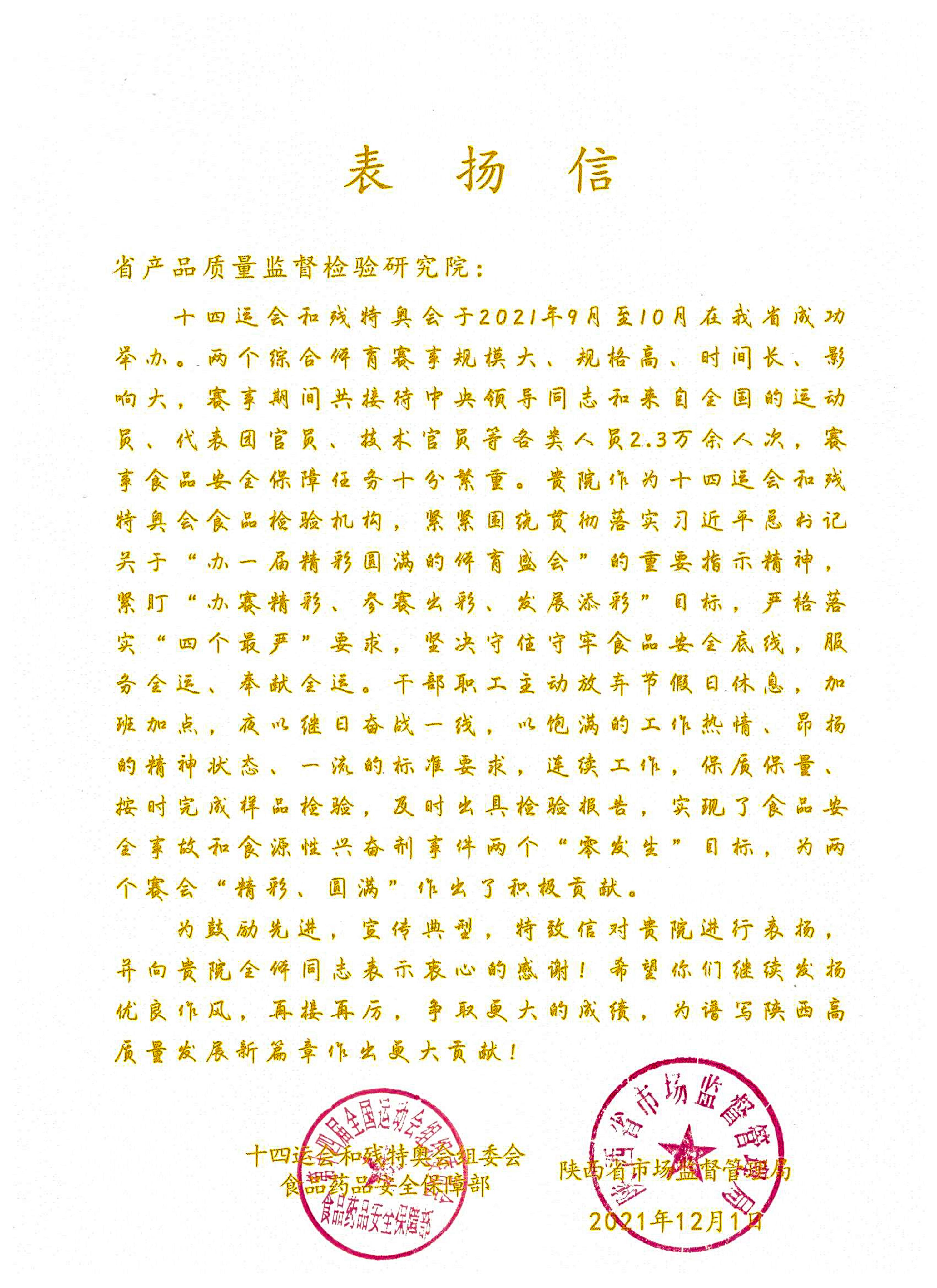 光荣凝聚力量,使命催人奋进。这份殊荣,是对我院检测能力和技术水平的充分肯定和认可,也是全体干部职工勠力同心、开拓创新、奋力拼搏、锐意进取的结果,大家备受鼓舞、倍感振奋、倍增信心。我院将以此为契机,认真总结此次全运会和残特奥会食品药品安全保障工作经验,不断固化有效措施和成果运用,持续提升检验检测技术能力,以习近平总书记来陕考察重要讲话精神为指引,认真贯彻落实党的十九届六中全会和省委十三届十次全会精神,弘扬伟大建党精神,以实干践行使命、以实绩回报信任,勇立潮头、接续前进、再创佳绩,为服务陕西经济高质量发展和人民生活幸福安康作出新的更大贡献!
