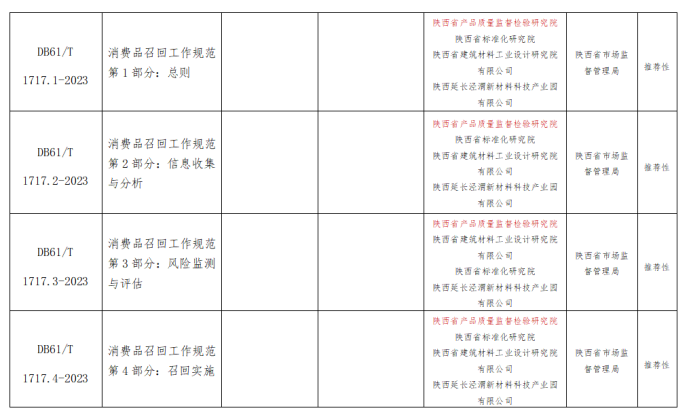 该系列标准共包含《消费品召回工作规范第1部分:总则》(DB61/T 1717.1-2023)、《消费品召回工作规范 第2部分:信息收集与分析》(DB61/T 1717.2-2023)、《消费品召回工作规范 第3部分:风险监测与评估》(DB61/T 1717.3-2023)、《消费品召回工作规范 第4部分:召回实施》四项内容。此标准的实施,有利于引导企业建立和完善消费品召回工作机制,推动企业主动开展消费品缺陷追溯和召回活动,及时消除消费品安全隐患,对推动企业有效落实质量安全主体责任、维护企业和消费者合法权益、促进我省消费品生产企业高质量发展具有积极意义。