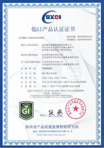 8月中旬,我院派出了由检查员及技术专家组成的专业检查组对陕西粮农物流集团有限公司开展工厂检查。检查组严格依据《低GI产品认证实施规则》及WS/T652-2019《食物血糖生成指数测定方法》等规范标准,围绕企业厂址环境、原辅料采购、低GI黑麦荞麦面产品生产过程、包装、储存运输等关键环节开展深入检查。经过全面、严谨的评审,该企业通过检查并获得认证证书。