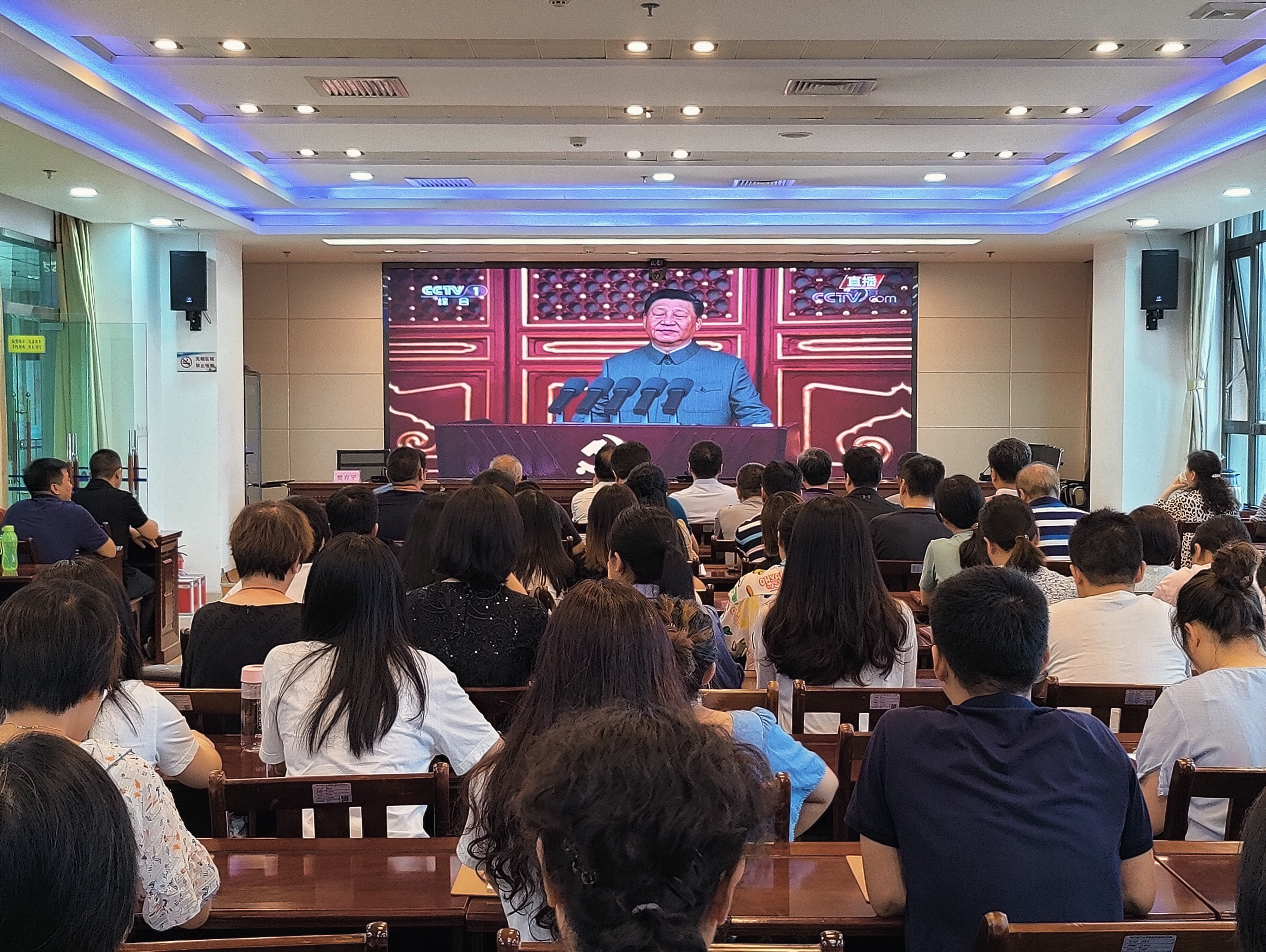 2021年7月1日上午8点,庆祝中国共产党成立100周年大会在北京天安门广场隆重举行,中共中央总书记、国家主席、中央军委主席习近平出席大会并发表重要讲话。省质检院组织党员干部集中观看了中央电视台中国共产党成立100周年大会实况直播,认真学习习近平总书记重要讲话,共同回顾党的百年奋斗光辉历程,展望中华民族伟大复兴的光明前景。